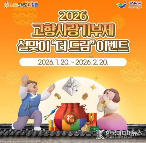 [ 한국미디어뉴스 이종철 기자 ] 장흥군은 설 명절을 앞두고 고향사랑기부제 활성화를 위해 1월 20일부터 2월 20일까지 ‘2026 설맞이 고향사랑기부제 더 드림 이벤트’를 진행한다.