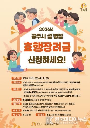 [ 한국미디어뉴스 이원영 기자 ] 공주시는 지역사회 효 문화 확산과 효행 문화 발전을 위해 설 명절을 맞아 ‘효행장려금’을 지급한다고 22일 밝혔다.