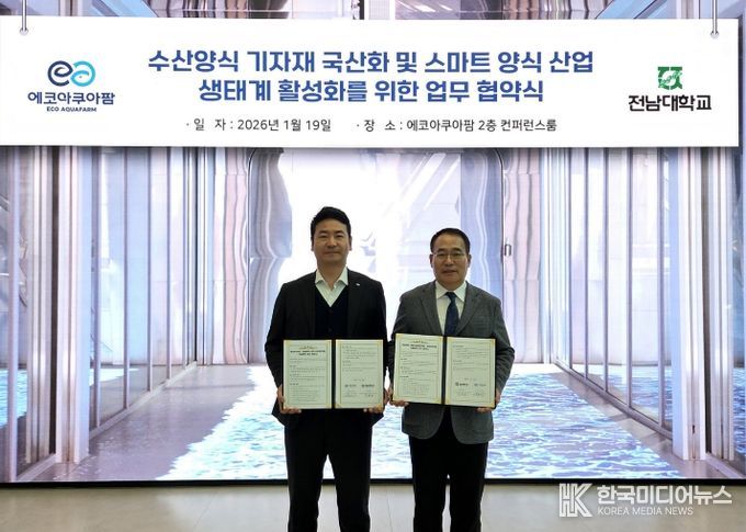 [ 한국미디어뉴스 이종철 기자 ] 전남대학교 스마트수산양식연구센터(센터장 김태호 교수)가 에코아쿠아팜(주)와 스마트양식 분야 기술협력 및 인력양성 강화를 위한 업무협약을 체결했다. 업무협약식은 19일 부산 에코아쿠아팜(주) 2층 컨퍼런스 홀에서 진행됐다.