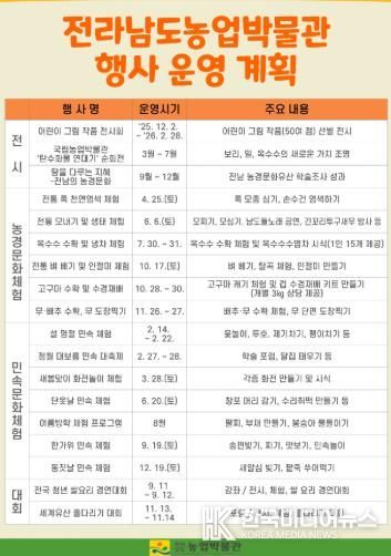김옥경 전남농업박물관장은 “2026년은 박물관이 농업과 문화를 잇는 융합 플랫폼으로 한 단계 더 나아가는 해가 될 것”이라며 “단순히 농경문화의 가치를 지키는 데 그치지 않고, 오늘의 일상에서 새롭게 살아 숨 쉬게 하는 것이 박물관의 역할”이라고 말했다. 이어 “전통의 뿌리를 바탕으로 미래를 준비하는 ‘열린 K-헤리티지 박물관’으로서 지역민과 방문객 모두가 전남 농경문화의 가치와 매력을 함께 느끼도록 힘쓰겠다”고 강조했다.