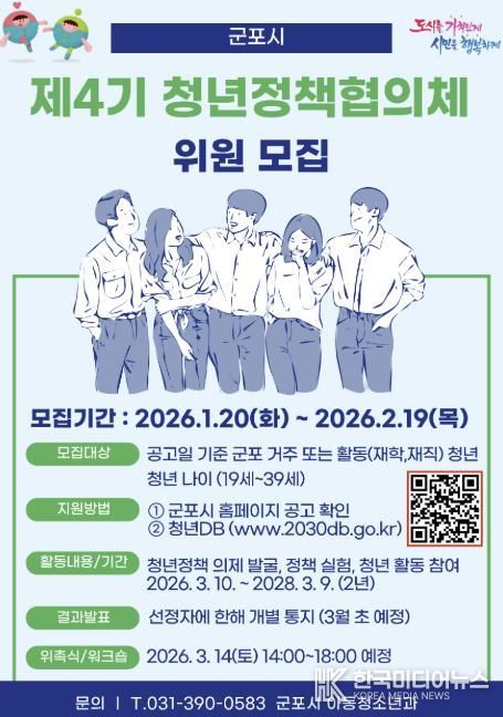[ 한국미디어뉴스 이보영 기자 ] 군포시(시장 하은호)는 제4기 군포시 청년정책협의체 위원을 오는 2월 19일(목)까지 모집한다고 밝혔다.