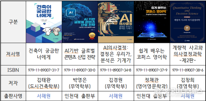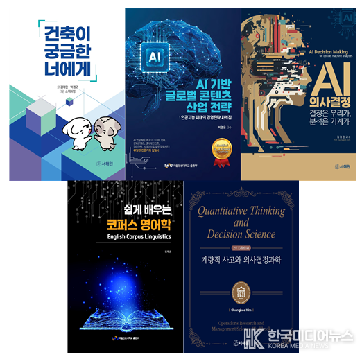 이번 신간은 도시건축학부 김태완 교수의 학술도서 『건축이 궁금한 너에게』, 무역학부 박영은 교수의 교양 공통도서 『AI 기반 글로벌 콘텐츠 산업 전략』, 무역학부 김경원 교수의 학술도서 『AI 의사결정: 결정은 우리가, 분석은 기계가』, 영어영문학과 정채관 교수의 학술도서 『쉽게 배우는 코퍼스 영어학』, 경영대학 김창희 교수의 학술도서 『계량적 사고와 의사결정과학(제2판)』 등 총 5종이다.