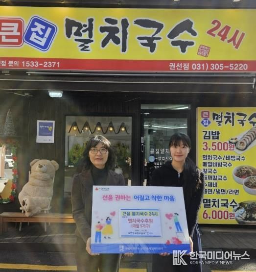 [ 한국미디어뉴스 이보영 기자 ] 권선1동 행정복지센터는 1월 22일, 관내 음식점인 “큰집멸치국수”가 지역 내 취약계층을 위해 매월 5 가구에 멸치국수를 정기 후원하기로 했다고 밝혔다.
