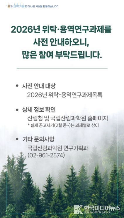 [ 한국미디어뉴스 이원영 기자 ] 산림청 국립산림과학원은 산림 연구 인프라를 내실화하고, 대학 및 연구기관과의 전략적 협업을 확대하기 위해 2026년 위탁·용역연구과제를 사전 안내한다고 밝혔다.
