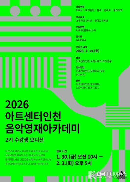 [ 한국미디어뉴스 이원영 기자 ] 인천경제자유구역청은 아트센터인천의 클래식 영재 발굴·육성 프로그램 ‘음악영재 아카데미’ 2기 수강생 선발을 위한 공개 오디션을 오는 2월 14일에 개최한다고 밝혔다.