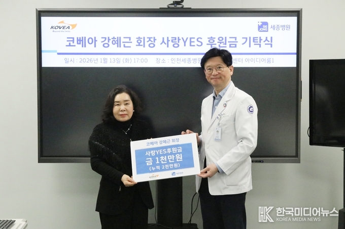 [ 한국미디어뉴스 이원영 기자 ] 혜원의료재단 세종병원(이사장 박진식)이 (주)코베아(회장 강혜근)으로부터 의료나눔 후원금 1천만원을 기탁받았다. 2024년 한차례 기부를 포함해 현재까지 누적 후원금은 총 2천만원이다.