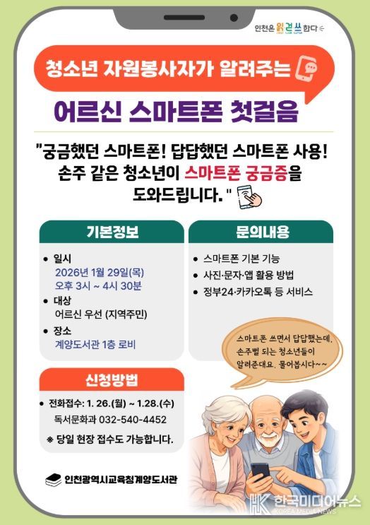 [ 한국미디어뉴스 이원영 기자 ] 인천광역시교육청계양도서관은 오는 29일 1층 로비에서 ‘어르신 스마트폰 첫걸음’행사를 운영한다.