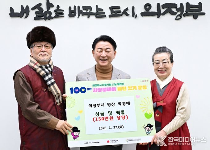 [ 한국미디어뉴스 김서안 기자 ] 의정부시는 2025년 의정부시 명장(식품가공 분야)으로 선정된 박경애 명장이 새해를 맞아 지역사회의 어려운 이웃을 위해 직접 만든 떡 50kg(100만 원 상당)과 성금 50만 원을 기탁하며 ‘100일간 사랑릴레이 배턴 잇기’에 동참했다고 밝혔다.