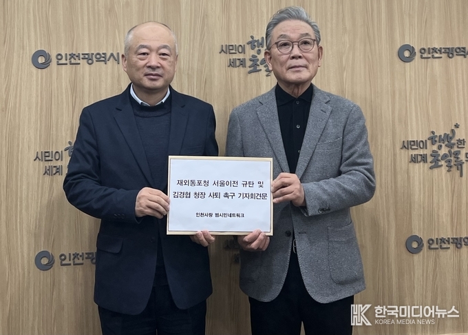 [ 한국미디어뉴스 이원영 기자 ] ‘재외동포청 서울 이전 규탄 및 김경협 청장 사퇴 촉구’ 기자회견이 27일 인천시청 브리핑룸에서 열렸다. <인천사랑 범시민 네트워크>는 인천지역 발전을 위해 모인 131개 기관‧단체의 연대체다.
