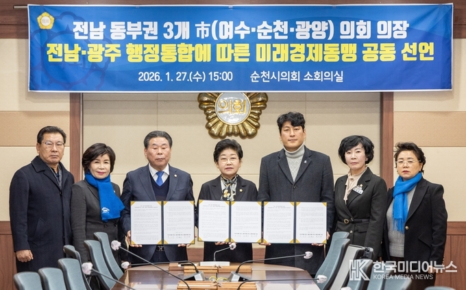 [ 한국미디어뉴스 이원영 기자 ] 전라남도와 광주광역시의 행정구역 통합 추진이 급물살을 타고 있는 가운데, 여수시의회, 순천시의회, 광양시의회는 27일 전남·광주 행정통합에 대응하여 전남동부권의 공동발전과 위상 강화를 위한 미래경제동맹 공동선언문을 발표했다고 27일 밝혔다.