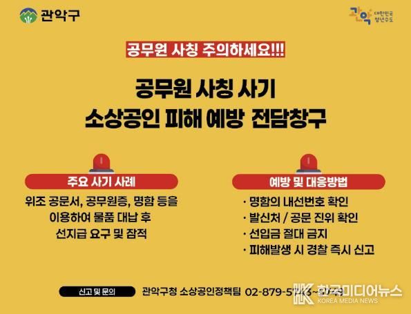 박준희 관악구청장은 “공무원 사칭 사기는 소상공인의 생계를 위협하는 파렴치한 범죄”라고 지적하며, “전담창구 운영을 통해 소상공인이 안심하고 생업에 전념할 수 있는 환경을 조성하고, 예방 중심의 행정 지원을 아끼지 않겠다”고 밝혔다.