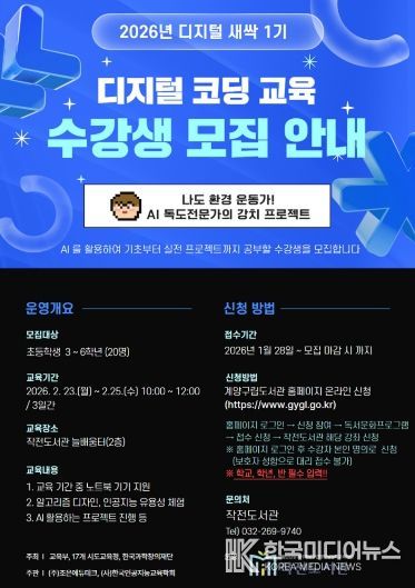 모집인원은 총 20명이며, 프로그램 신청은 1월 28일 오전 10시부터 모집 마감 시까지 계양구립도서관 누리집을 통해 선착순으로 진행된다.