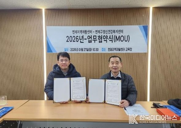 [ 한국미디어뉴스 이원영 기자 ] 연제지역자활센터(센터장 정덕용)는 1월 27일 연제구정신건강복지센터(센터장 설장우)와 자활근로 참여자나 종사자를 대상으로 다양한 복지서비스 제공을 위한 상호 업무협약(MOU)을 체결했다.