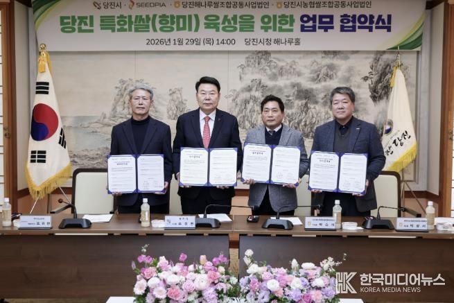 [ 한국미디어뉴스 이원영 기자 ] 당진시는 지난 29일 당진시청 해나루홀에서 ㈜시드피아, 통합RPC와 함께 ‘신품종 벼 실증 및 유통 활성화’를 위한 3자 간 업무협약을 체결했다고 30일 밝혔다.