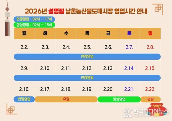 2월 2일부터 16일까지 기존 오후 3시였던 영업시간을 오후 5시까지 2시간 연장하고, 정기 휴무일인 2월 8일과 2월 15일에도 정상적으로 연장 운영해 장보기에 불편이 없도록 할 계획이다.