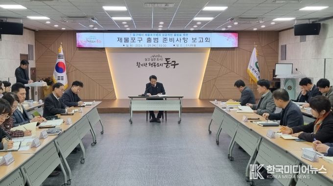 [ 한국미디어뉴스 이원희 기자 ] 인천 동구는 지난 29일 구청 소나무홀에서‘제물포구 출범 준비사항 보고회’를 개최했다고 밝혔다. 보고회는 김찬진 동구청장이 직접 주재했으며 구청 전 부서장들이 참석해 심도있게 진행됐다.
