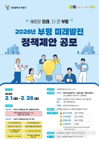 [ 한국미디어뉴스 양선희 기자 ] 부평구는 2026년도 ‘부평 미래발전 정책 제안 공모’를 2월 한 달간 실시한다.