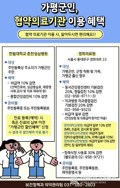 가평군은 대형 의료기관 이용 부담을 줄이기 위한 협약 의료서비스도 시행하고 있다. 한림대학교 춘천성심병원, 경희의료원 2곳과 협약을 맺어 군민이 해당 병원을 이용할 경우 비급여 진료비 등을 감면받도록 했다. 다만 협약 의료기관 감면 혜택은 예약 단계 또는 진료비 납부 이전에 신청한 경우에만 적용된다. 이미 결제가 완료된 건에 대해서는 소급 적용이 되지 않아 주의가 필요하다. 협약 의료기관을 이용해 감면 혜택을 받은 군민이 연간 4,000여 명에 달할 정도로 좋은 반응을 얻고 있다.