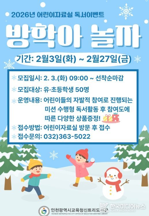 [ 한국미디어뉴스 이원영 기자 ] 인천광역시교육청신트리도서관은 2월 3일부터 27일까지 어린이들의 독서 습관 형성을 위한 겨울방학 이벤트 ‘방학아 놀자’를 운영한다.