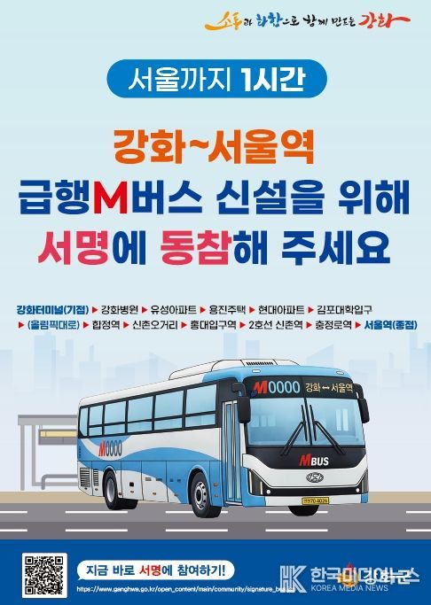 [ 한국미디어뉴스 이원희 기자 ] 강화군은 ‘강화~서울역 M버스(광역급행버스)’ 노선 신설 유치를 위해 대규모 범군민 서명운동을 전개하며, 대대적인 행정력 집중에 나선다.