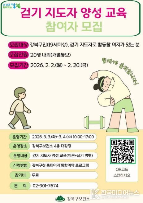모집 대상은 걷기 지도자로 활동할 의지가 있는 만 19세 이상 강북구민이며, 모집 인원은 20명 내외이다. 신청은 2월 20일까지 강북구청 홈페이지 통합예약 시스템을 통해 가능하다.