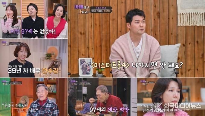한편, 전수경의 아버지는 의문의 기계를 켠 뒤 장부(?)를 꺼냈다. 이것이 건강의 비결이 담긴 비책인지 호기심이 집중됐다. 그러나 그 정체는 노래방 기계와 직접 작성한 애창곡 명단이었다. 아버지는 내공이 느껴지는 구수한 노랫가락을 뽑아냈다. 무대 매너는 기본이고 완벽한 음정과 박자를 갖춘 아버지는 흥겨운 춤사위까지 선보였고, 제작진도 이에 들썩였다. 가사도 읽지 않고 노래하는 아버지의 모습에 수빈은 “가사를 다 외우고 계시나 봐요”라며 신기해했다. 한혜진은 “전수경 씨가 아버지 닮으셨나 보다”라며 대를 잇는 가창력을 인정했다. 이에 전현무는 “다음에 ‘미스터트롯’ 나가시면 안 돼요?”라며 적극 추천에 나섰다.