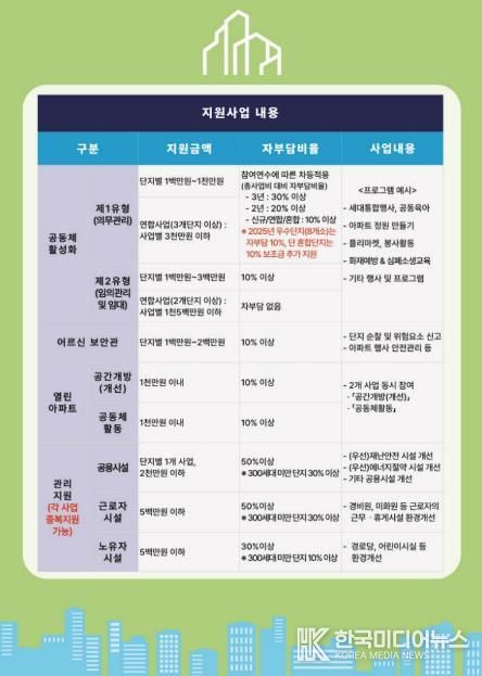 ▲ 공동체 활성화 분야는 주민 간 교류와 참여를 확대하기 위한 행사·프로그램을 지원하는 사업이다. 단지별 최대 1천만 원, 3개 단지 이상 연합 사업의 경우 최대 3천만 원까지 지원한다.