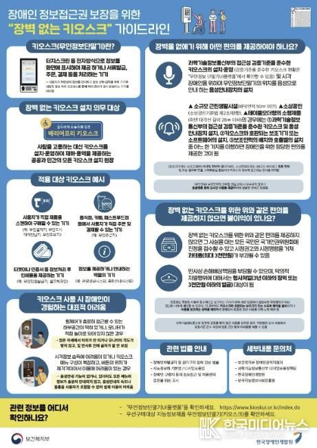 최근 개정된 ‘장애인차별금지 및 권리구제 등에 관한 법률’ 시행령에 따라, 공공과 민간에서 키오스크(무인정보단말기)를 설치·운영하는 경우 접근성 검증 기준을 충족하는 기기를 사용하고, 시각장애인을 위한 음성 안내 장치를 갖춰야 한다.