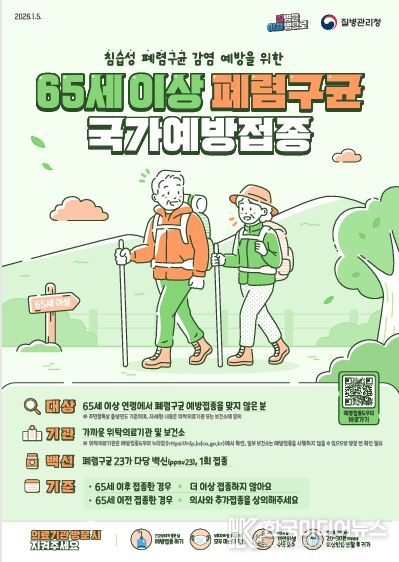 [ 한국미디어뉴스 이종철 기자 ] 전북특별자치도는 4일 도내 65세 이상 어르신의 건강 증진과 침습성 폐렴구균 감염증 예방을 위해‘폐렴구균 무료 예방접종’에 적극 참여해 줄 것을 당부했다.