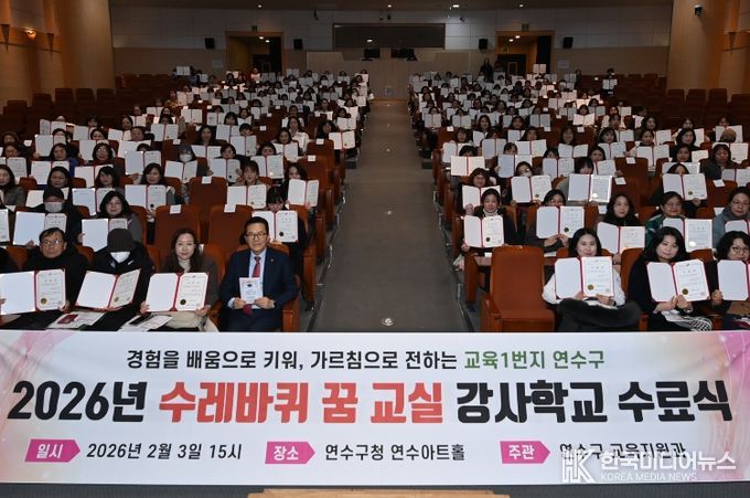 [ 한국미디어뉴스 이원영 기자 ] 연수구는 지난 3일 구청 연수아트홀에서 ‘2026년 수레바퀴 꿈 교실 강사학교’ 수료식을 성황리에 개최했다.