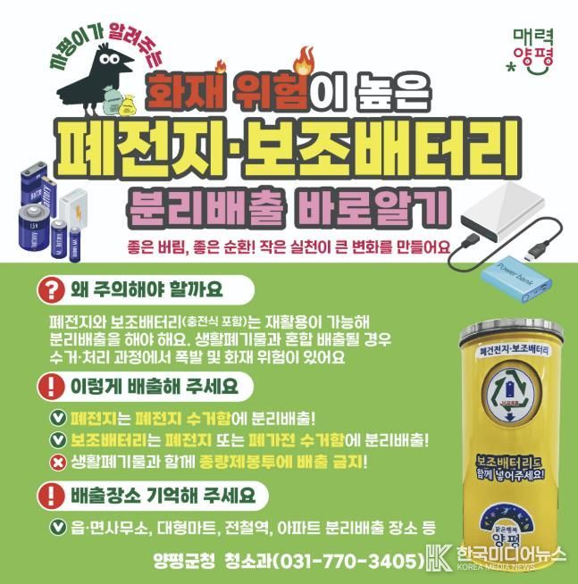 [ 한국미디어뉴스 민경환 기자 ] 양평군은 최근 보조배터리와 충전용 전지를 일반쓰레기로 배출해 수거·처리 과정에서 화재가 발생할 우려가 커짐에 따라, 해당 폐기물을 반드시 폐전지 수거함에 배출해 줄 것을 군민들에게 적극 홍보하고 있다고 밝혔다.