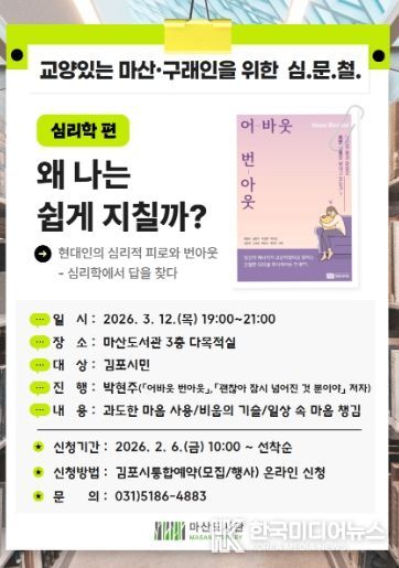 [ 한국미디어뉴스 이원희 기자 ] 김포시 마산도서관은 심리적 피로와 번아웃을 주제로 한 인문교양 강연 '왜 나는 쉽게 지칠까?'를 오는 3월 12일 오후 7시부터 9시까지 마산도서관 3층 다목적실에서 운영한다.