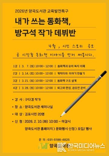 [ 한국미디어뉴스 이원희 기자 ] 김포시 양곡도서관은 오는 3월 7일부터 3월 28일까지 매주 토요일, 시민을 대상으로 한 그림책 글쓰기 수업 '내가 쓰는 동화책, 방구석 작가 데뷔반'을 운영한다.