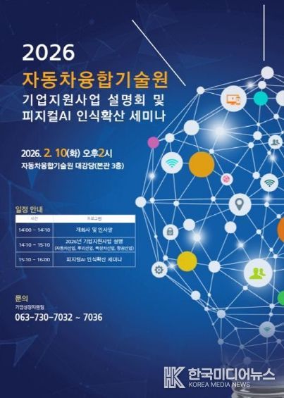 [ 한국미디어뉴스 이종철 기자 ] 전북특별자치도는 도내 자동차·뿌리·특장·항공산업 등 주력산업의 경쟁력 강화를 위해 오는 10일 자동차융합기술원에서 ‘2026년 기업지원사업 설명회 및 피지컬AI 산업 인식확산 세미나’를 개최한다고 5일 밝혔다.