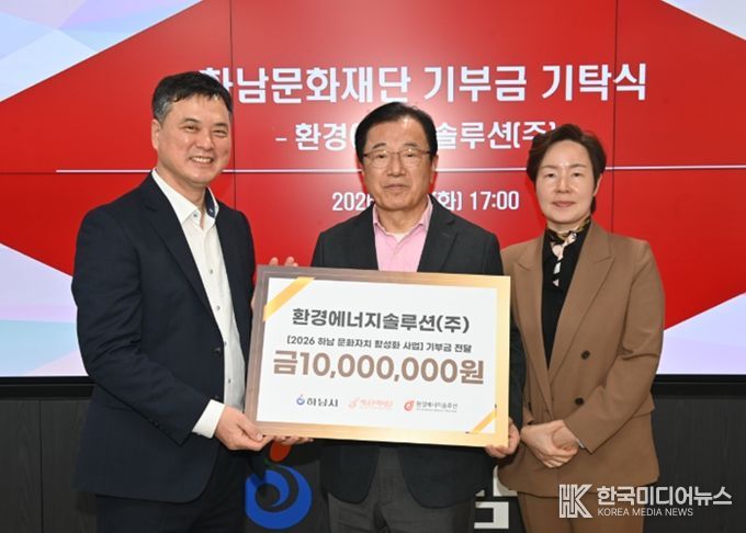 [ 한국미디어뉴스 김서안 기자 ] (재)하남문화재단은 2월 4일, 하남시청에서 환경에너지솔루션㈜으로부터 문화자치 활성화를 위한 기부금 1천만 원을 전달받았다고 밝혔다. 이날 기부식에는 이현재 하남시장을 비롯해 기업 및 재단 관계자들이 참석해 지역 상생과 ESG 실천의 의미를 공유했다.