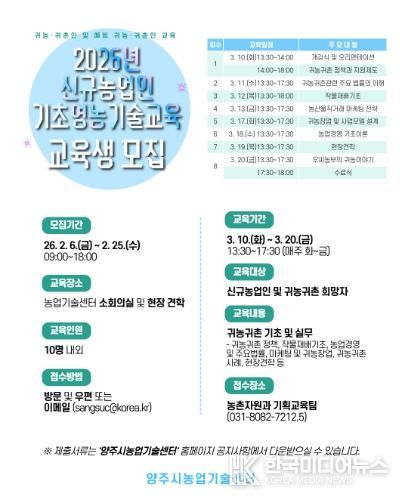 [ 한국미디어뉴스 김서안 기자 ] 양주시는 농촌지역으로 이주한 귀농․귀촌인과 예비 귀농인의 안정적인 농촌 정착을 지원하기 위해 ‘2026년 신규농업인 기초영농기술교육’ 교육생을 모집한다.
