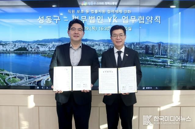 [ 한국미디어뉴스 이원영 기자 ] 서울 성동구는 지난 1월 29일 직원 보호 등 법률 지원 협력체계 강화를 위해 법무법인 YK와 업무협약을 체결했다고 밝혔다.
