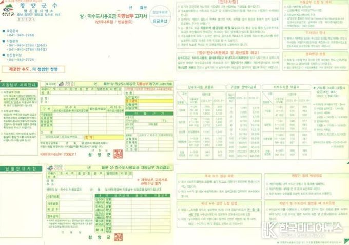 [ 한국미디어뉴스 이원영 기자 ] 청양군이 군민의 소중한 개인정보를 보호하고 고지서 가독성을 높이기 위해 상·하수도 요금 고지서를 기존 지로형에서 ‘봉합형’으로 전면 개편한다.