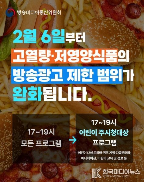 [ 한국미디어뉴스 황영수 기자 ] ■ 2월 6일부터 고열량·저영양식품의 방송광고 제한 범위가 완화됩니다.