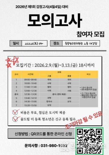 이번 모의고사는 김포시 학교 밖 청소년(중졸, 고졸 검정고시 응시 대상자)을 대상으로 3월 28일 시행되며, 접수는 센터에 등록된 청소년 또는 등록을 희망하는 관내 학교 밖 청소년을 대상으로 진행된다. 모의고사 참여를 희망하는 청소년은 3월 13일 18시까지 온라인 접수(QR코드 참고)를 통해 선착순으로 접수하고 있다.