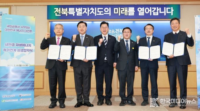 [ 한국미디어뉴스 이종철 기자 ] 전북특별자치도가 9일 도청에서 새만금개발청, 한국전력공사, 한국수력원자력㈜와 함께 '새만금 수상태양광(1단계) 발전사업'의 적기 구축을 위한 상호 협력 업무협약(MOU)을 체결했다.