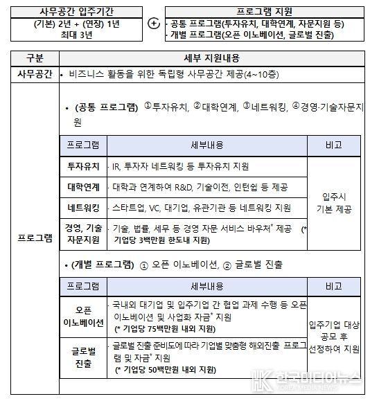이번에 모집하는 입주기업은 K-StartHub 개관 이후 처음으로 입주를 시작하는 기업들로 사업의 시작을 함께하게 된다. 입주기업은 독립형 사무공간을 비롯해 회의실, 라운지 등 업무 인프라가 제공되며, 비입주기업도 멤버십 형태로 공유오피스를 이용할 수 있다. 또한, 창업기업들의 원활한 경영을 위해 기술·법률·세무 등에 관한 자문 서비스, 오픈이노베이션·글로벌 진출·투자 연계 등 스케일업 프로그램도 함께 지원받을 수 있다.