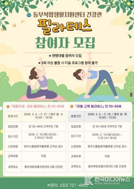 [ 한국미디어뉴스 이원영 기자 ] 원주시 동부복합생활지원센터 건강관은 오는 19일부터 중·장년을 대상으로 한 필라테스 프로그램 참여자를 모집한다.