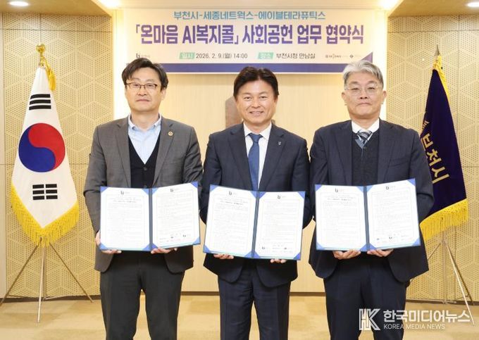 [ 한국미디어뉴스 김만길 기자 ] 부천시는 지난 9일 시청 만남실에서 세종네트웍스와 에이블테라퓨틱스와 함께 ‘온마음 AI복지콜’ 사회공헌 업무 협약을 체결했다.