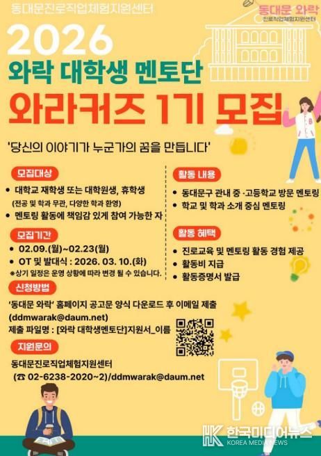 이번 모집은 동대문구 중·고등학생들에게 보다 현실적인 진로 및 학과 정보를 제공하고, 대학생 멘토들의 실제 경험을 바탕으로 진로 설계에 도움을 주고자 기획됐다. 선발된 와라커즈(WARAKERS)는 지역 내 중·고등학교를 방문해 학교 및 학과 소개를 중심으로 한 멘토링 활동을 진행할 예정이다.
