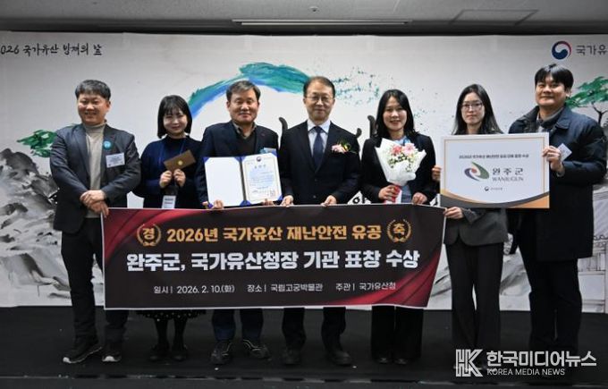 [ 한국미디어뉴스 이종철 기자 ] 완주군이 10일 서울 국립고궁박물관에서 전국 시군 중 유일하게 ‘2026 국가유산 재난 안전 유공’ 국가유산청장 기관 표창을 수상했다.