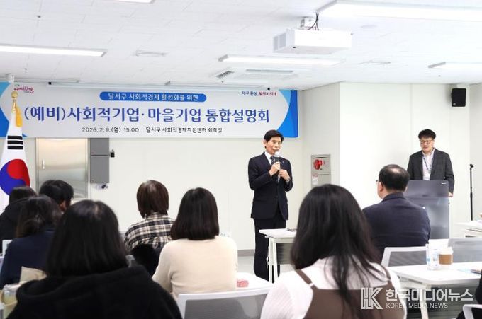 [ 한국미디어뉴스 이보영 기자 ] 대구 달서구는 지난 9일, 달서구 사회적경제지원센터에서 관내 사회적기업 및 마을기업 대표 등 관계자 50여 명이 참석한 가운데‘사회적기업·마을기업 통합설명회’를 성황리에 개최했다.