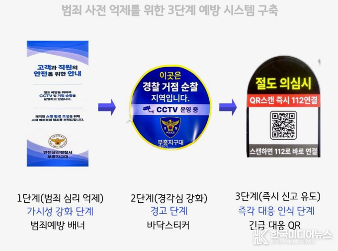 먼저, 마트 등 다중이용시설에 범죄예방 홍보 배너를 설치하여 경찰 순찰 활동을 시각적으로 노출하고, 범죄 심리를 억제하기 위해 주요 이동 동선에 경고 스티커를 부착하였으며 , 긴급 대응 QR코드를 설치하여 신고 접근성을 높이는 등 초기 대응 시간을 단축하는 기반을 마련했다.