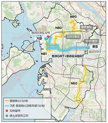 - 2단계(확대도입): 인천대로, 경인로 등 신규 중앙버스전용차로 구축 구간으로 노선을 확대하여 광역교통 주요 거점 간 연결성을 강화