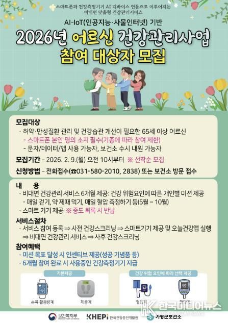 참여 대상자는 65세 이상 어르신으로, 9일부터 오는 3월 13일까지 120명을 선착순 모집하고 있다. 신청은 가평군보건소 1층 심뇌혈관질환실 방문 또는 전화(031-580-2010, 2838)로 가능하다. 사업 기간은 5월부터 10월까지 약 6개월이다.